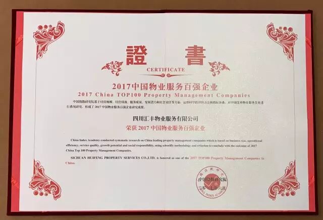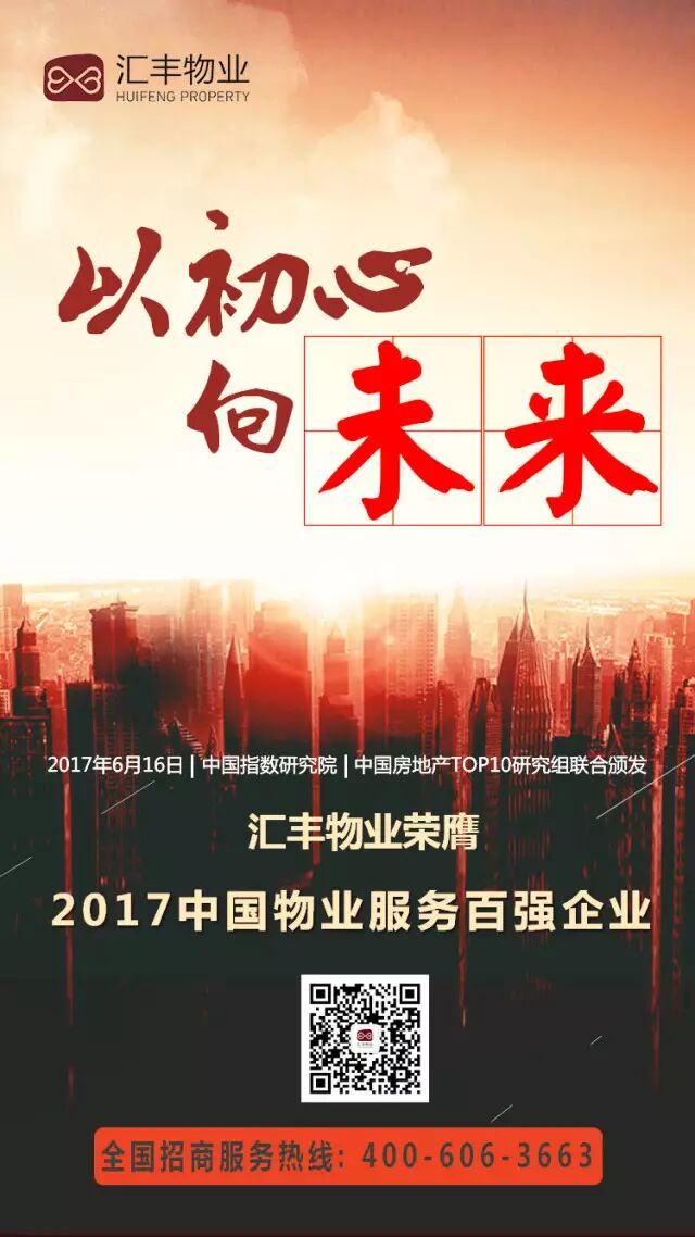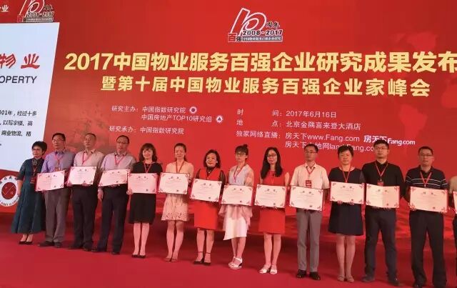 今日,由中国指数研究院和中国房地产TOP10研究组主办的“2017中国物业服务百强企业研究成果发布会暨第十届中国物业服务百强企业家峰会”在北京召开。大会上发布了“2017中国物业服务百强企业”名单,汇丰物业再度荣膺“2017中国物业服务百强企业”称号。